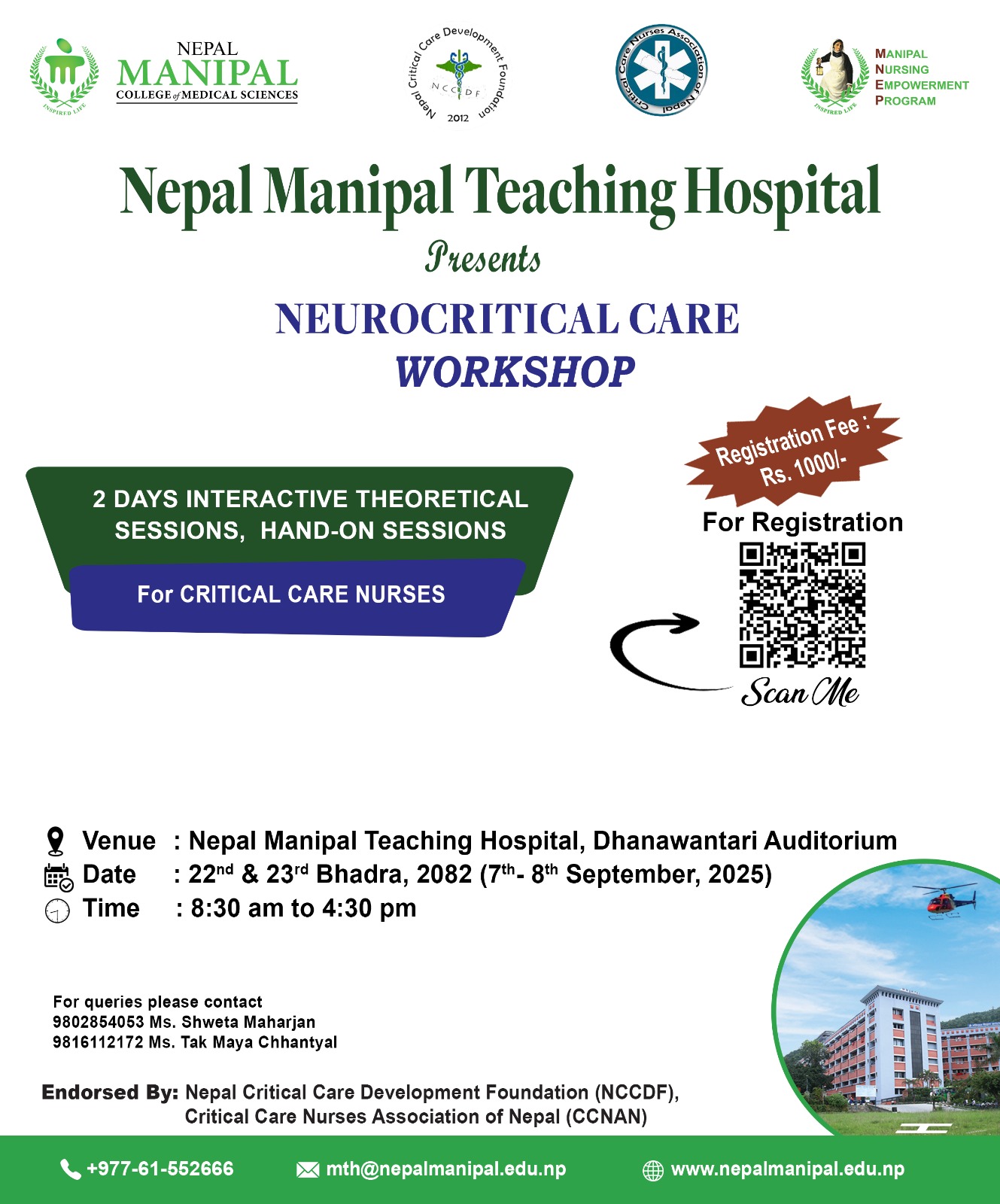 नेपाल मणिपाल टिचिंग अस्पतालले नेपाल क्रिटिकल केयर डेभलपमेन्ट फाउन्डेसन र क्रिटिकल केयर नर्सेज एसोसिअसन अफ नेपालको सहकार्यमा गर्न लागेको उक्त कार्यशालामा क्रिटिकल केयरको क्षेत्रमा लामो अनुभव संगालेका बिज्ञ डाक्टर एबम नर्सहरुले विभिन्न बिषयमा प्रस्तुती दिनुको साथै आंफ्नो अनुभव आदान प्रदान गर्नेछन।