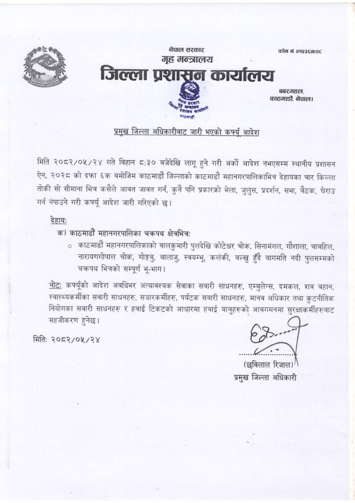 जिल्ला प्रशासन कार्यालय काठमाडौंले मंगलबार बिहान साढे ८ बजेदेखि अर्को आदेश नभएसम्म काठमाडौँ महानगरको चक्रपथ क्षेत्रभित्र कर्फ्यू आदेश जारी गरेको जनाएको छ। काठमाडौँका प्रमुख जिल्ल अधिकारी छबिलाल रिजालको नामबाट जारी आदेशमा काठमाडौँको बिभिन्न स्थान तोकिएको छ।
