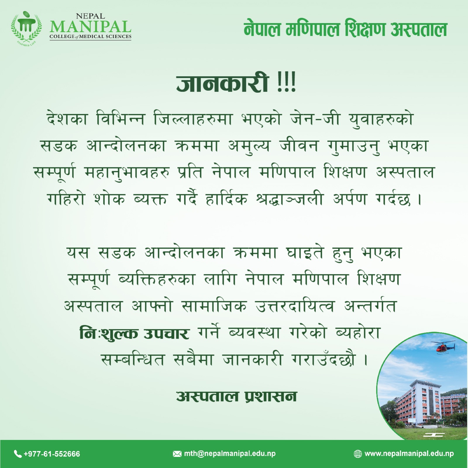 अस्पतालले देशका बिभिन्न स्थानमा प्रदर्शनको क्रममा मृत्युबरण गर्न पुगेका हरुप्रति श्रद्दान्जली प्रकट गर्नुको साथै घाइएहरुको शिघ्र स्वास्थ्यलाभको कामना समेत गरेको अस्पताल प्रशासनले जनाएको छ