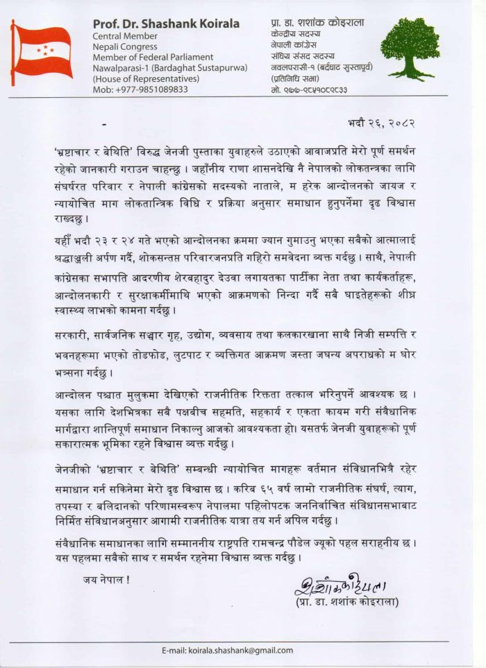 कांग्रेस नेता कोइरालाले बिहिबार जारी गरेको एक बिज्ञप्तीमा भ्रष्टाचार र बेथितिको विरोधमा उठेका जेनजी युवाहरूको आन्दोलनप्रति आफ्नो पूर्ण समर्थन रहेको समेत जनाउंदै संवैधानिक र लोकतान्त्रिक मार्गबाट मात्रै मुलुकलाई निकास दिन सकिने उल्लेख गरेका छन कोईरालाले पछिल्लो परिस्थितीमा राष्ट्रपति रामचन्द्र पौडेलको पहलको प्रशंसा पनि गरेका छन् । वक्तव्यमा उनले भनेका छन् ‘सहमति, सहकार्य र एकता’ कायम गरी अघि बढ्न जेनजी युवासहित सबै पक्षलाई अपिल गर्दछु ।