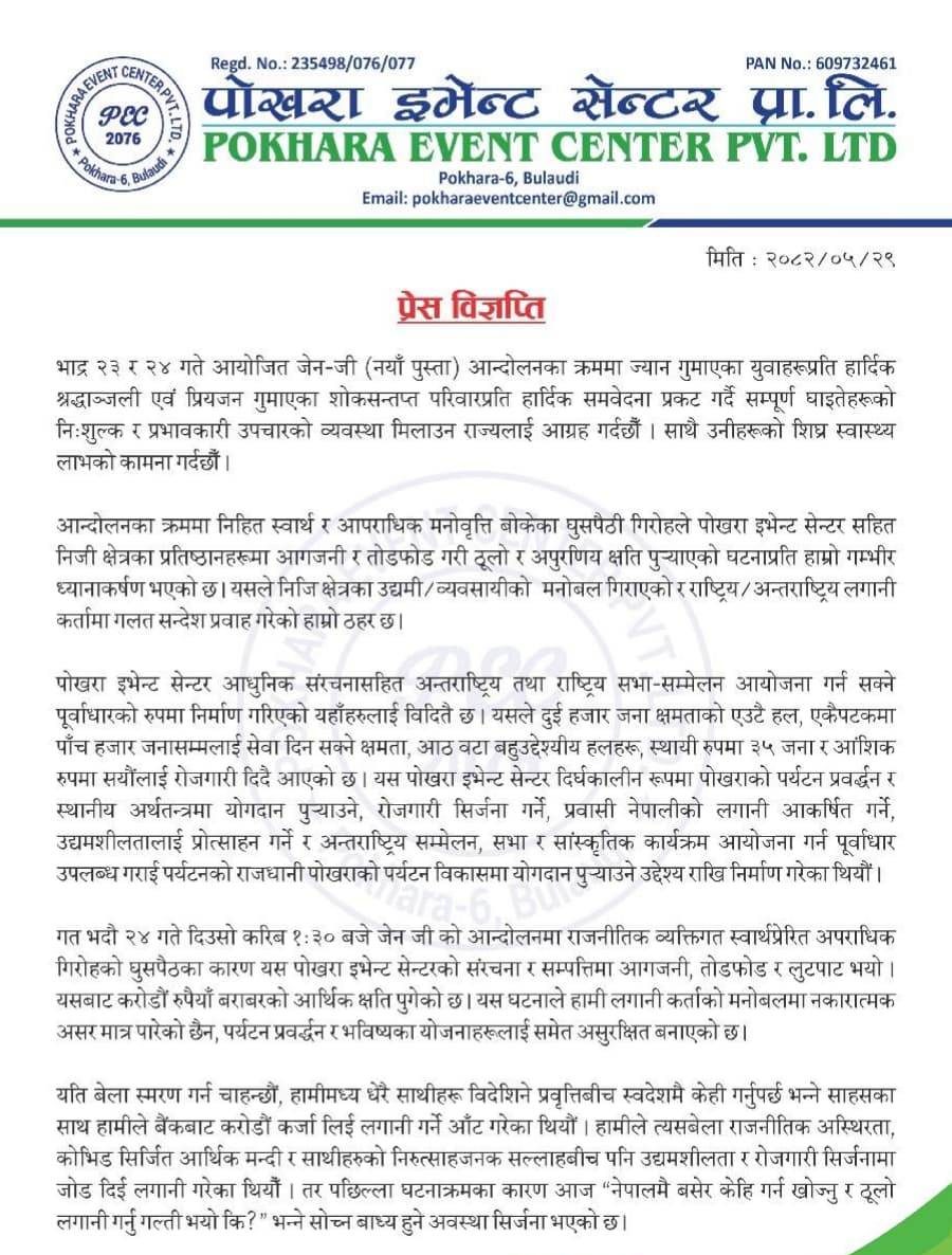 पोखरा, जेनजी पुस्ताको नाममा भएको आन्दोलनका क्रममा भदौ २४ गते आगजनी, तोडफोड र लुटपाट गरिएको पोखरा इभेन्ट सेन्टरका संचालकहरुले राजनीतिक र व्यक्तिगत स्वार्थप्रेरित आपराधिक गिरोहको घुसपैठका कारण इभेन्ट सेन्टर सहितका निजि सम्पति र संरचना ध्वस्त पारिएको भन्दै यसबाट करोडौं रुपैयाँ बराबरको क्षति पुगेको जनाएका छन।