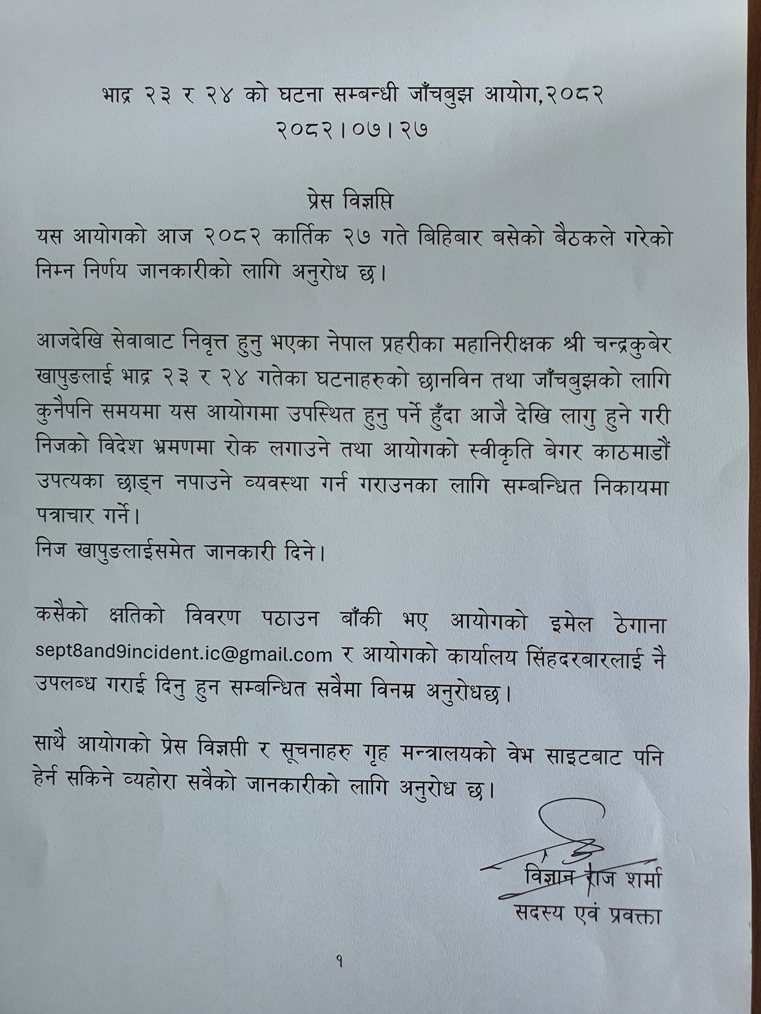 पोखरा, आज बिहिबारदेखि नै नेपाल प्रहरीको सर्वोच्चपद अर्थात प्रहरी महनिरिक्षक पदबाट सेवा निवृत्त भएका चन्द्रकुवेर खापुङलाई विदेश जान रोक लगाइएको छ। गत भदौ २३ र २४ गते जेनजी पुस्ताको नाममा भएको आन्दोलनक क्रममा राज्य पक्षबाट गोलि चलाइएको घटना सम्बन्धमा जाँचबुझ गर्न गठित आयोगको बैठकले खापुङलाई विदेश जान रोक लगाउने निर्णय गरेको बताइएको छ ।