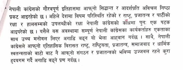 सभापति शर्माले आन्तरिक स्वार्थका कारण केन्द्रीय समिति अनिर्णयको बन्दि बनेको बताउंदै कांग्रेसले धार्मिक स्वतन्त्रता, प्रजातन्त्र, समाजवाद छोडेर आंफ्नो विरासतमा नफर्किने हो भने जो सभापति बने पनि देशलाई केही दिन नसक्ने दाबी गरे ।
