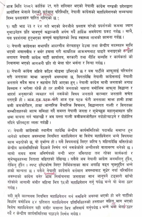 गण्डकी प्रदेश समितिले कांग्रेस संगठन समयअनुकूल परिमार्जन हुन नसक्दा कार्यकर्ता र आम जनतामा निराशा बढ्दै गएको निष्कर्ष निकालेको छ। प्रस्तावमा भनिएको छ “अब एक पटक फेरि जनतासँग माफी माग्दै आत्मालोचनासहित सुधारतर्फ फर्किनैपर्छ।” बैठकमा सहभागी नेताहरूले पार्टीभित्र बढ्दो असन्तुष्टि, नेतृत्वप्रतिको अविश्वास र निर्णय गर्न नसक्ने प्रवृत्तिले संगठन कमजोर हुँदै गएको चेतावनी दिएका छन्।