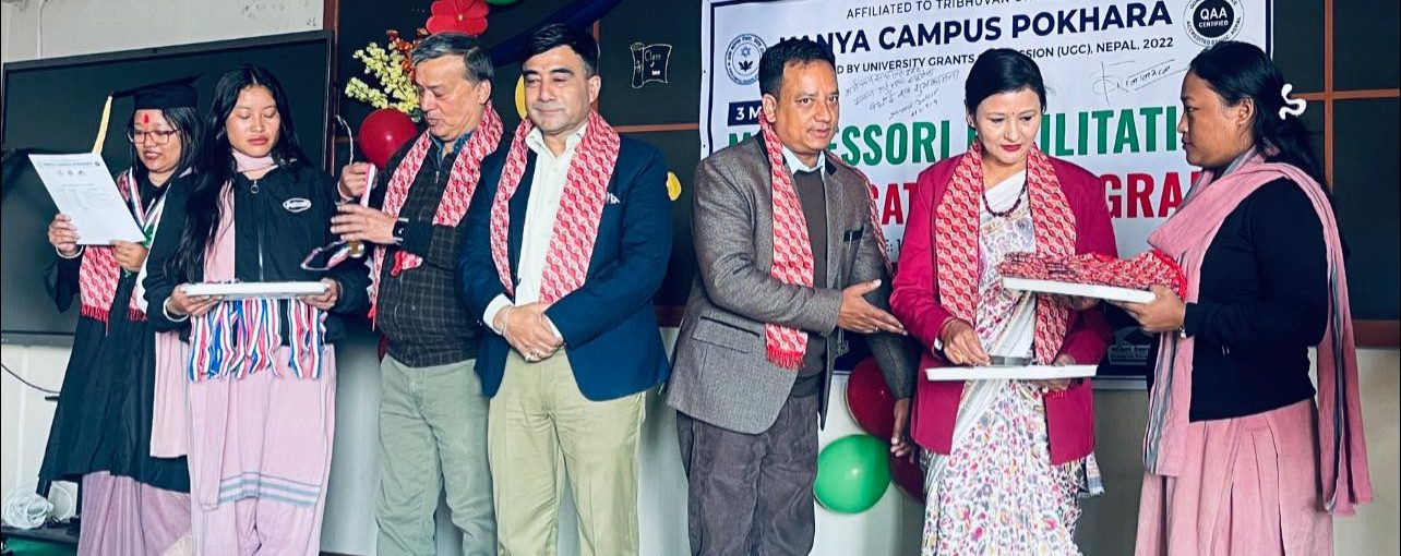 पोखरा, पोखराको नदीपुरस्थित कन्या क्याम्पसमा अध्ययनरत छात्राहरुका लागि तिन महिने मन्टेश्वरी तालिमको आयोजना गरियो। क्याम्पसको पढाई सकिएसंगै बिभिन्न मन्टेश्वरीमा काम गर्न सक्ने सिप र दक्षता अभिवृद्धि गर्ने उद्धेश्यका साथ तालिमको आयोजना गरिएको बताईएको छ।
