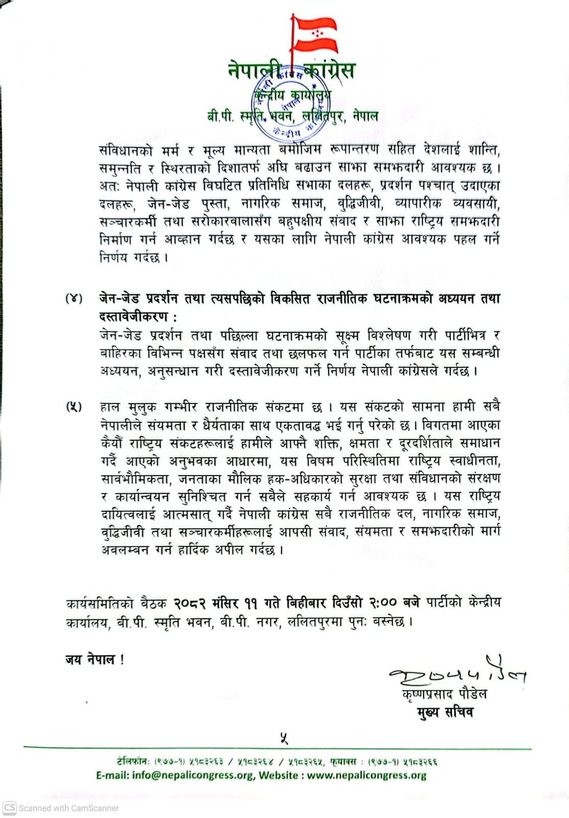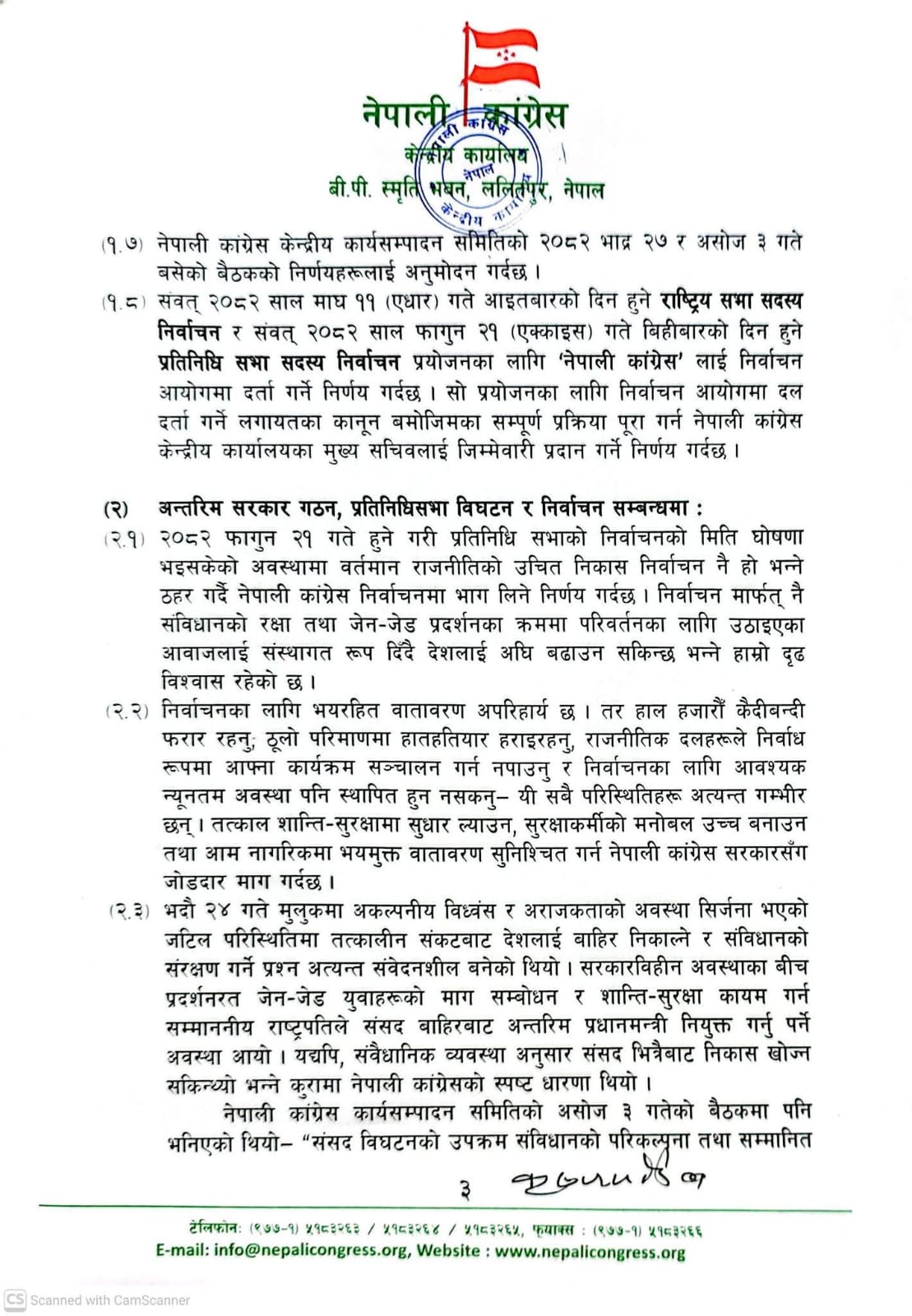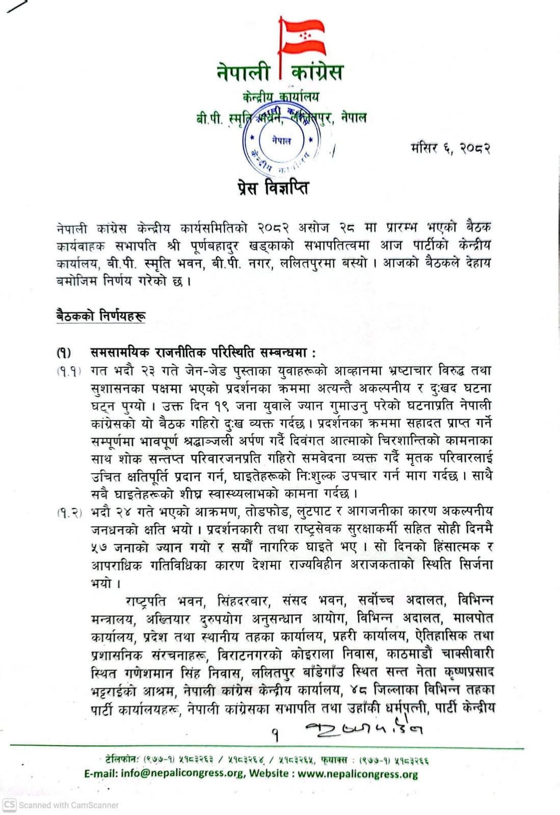 यसैबीच, जेनजी पुस्ताको नाममा भदौ २३ र २४ गते भएको आन्दोलनका क्रममा हिंसात्मक घटना, संसद विघटन र अन्तरिम सरकार गठनपछि उत्पन्न परिस्थितिबारे आफ्नो आधिकारिक धारणा सार्वजनिक गर्दै कांग्रेसले संविधानको रक्षा र आन्दोलनका जायज आवाजलाई संस्थागत गर्न चुनावमा जानुको विकल्प नभएको ठहर गरेको छ । बैठकले आगामी माघ ११ गते हुने राष्ट्रिय सभा र फागुन २१ गते हुने प्रतिनिधि सभा निर्वाचनका लागि दल दर्ता गर्ने जिम्मेवारी मुख्य सचिवलाई दिएको बैठक पछि सार्बजनिक गरिएको बिज्ञप्तीमा जनाइएको छ ।