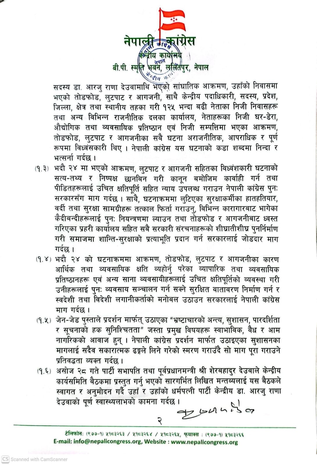कांग्रेसले भदौ २४ गतेको घटनामा सभापति शेरबहादुर देउवा र उनकी पत्नी आरजु राणा देउवामाथि गरिएको सांघातिक आक्रमण, उनीहरूको निवाससहित देशभरका १२५ भन्दा बढी नेताका घर, पार्टी कार्यालय र सरकारी संरचनामा गरिएको आगजनी तथा तोडफोडको घटनालाई कांग्रेसले ‘राज्यविहीन अराजकता’ को संज्ञा दिएको छ । उक्त घटनामा ५७ जनाको ज्यान गएको र अर्बौंको क्षति भएको भन्दै कांग्रेसले पीडितलाई क्षतिपूर्ति, घाइतेको उपचार र लुटिएका हतियार फिर्ता गराउन सरकारसँग माग गर्ने निर्णय गरेको कांग्रेस केन्द्रिय कार्यालयका मुख्य सचिब कृष्णप्रसाद पौडेलले जानकारी दिए।