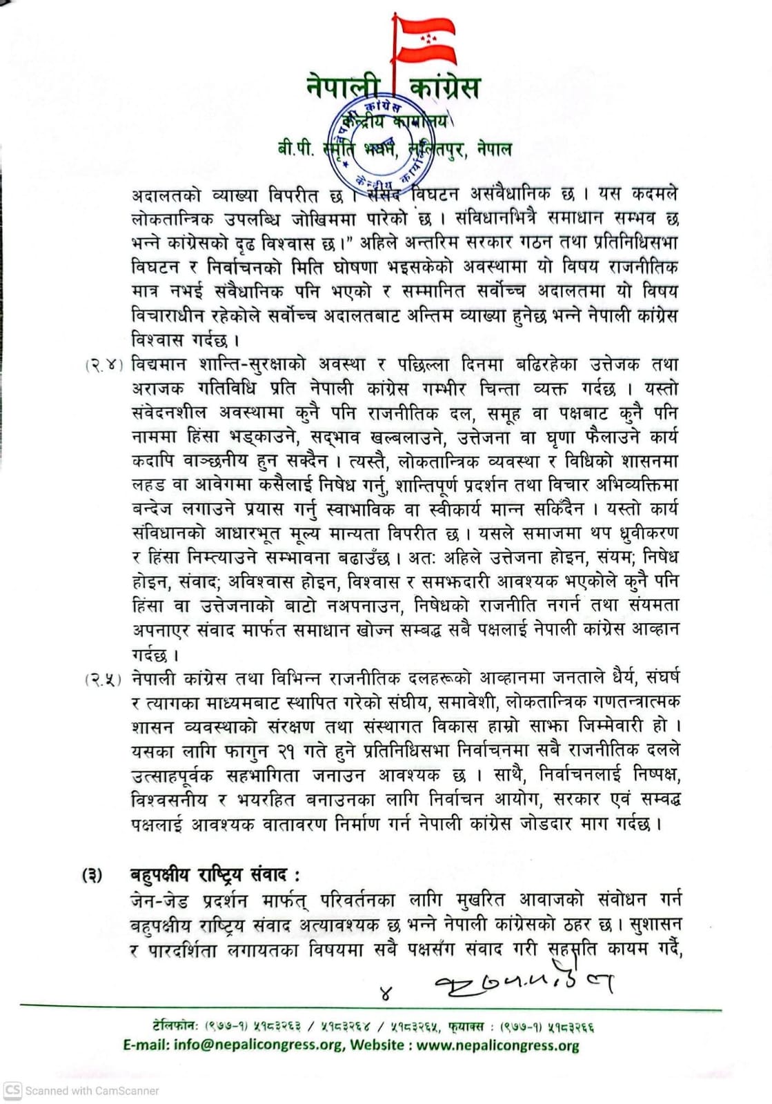 काठमाडौँ, नेपाली कांग्रेसले फागुन २१ गते तोकिएको प्रतिनिधि सभाको निर्बाचनमा भाग लिने भएको छ गत असोज २८ गतेबाट निरन्तर चलेको कांग्रेस केन्द्रीय समितिको बैठकले शनिबार निर्बाचनमा भाग लिने औपचारिक निर्णय गरेको हो मुलुकमा उत्पन्न विषम राजनीतिक परिस्थितिका बीच अहिलेको राजनीतिको निकास निर्वाचन नै रहेको निष्कर्ष कांग्रेसले निकालेको हो ।