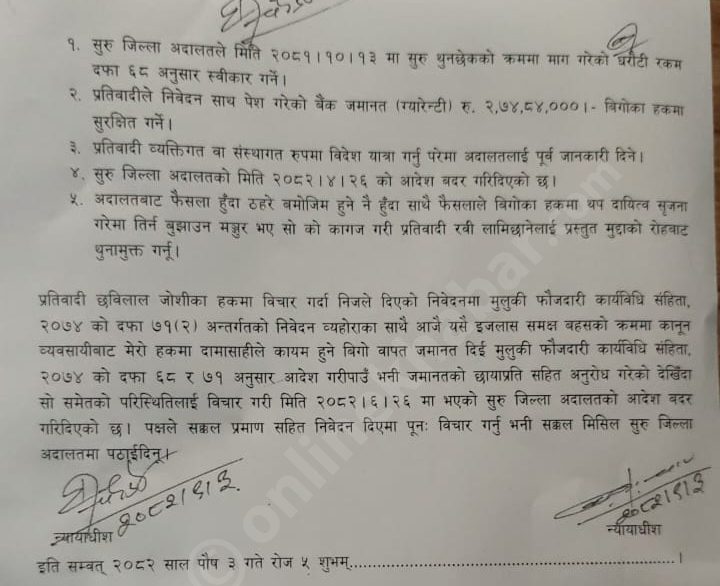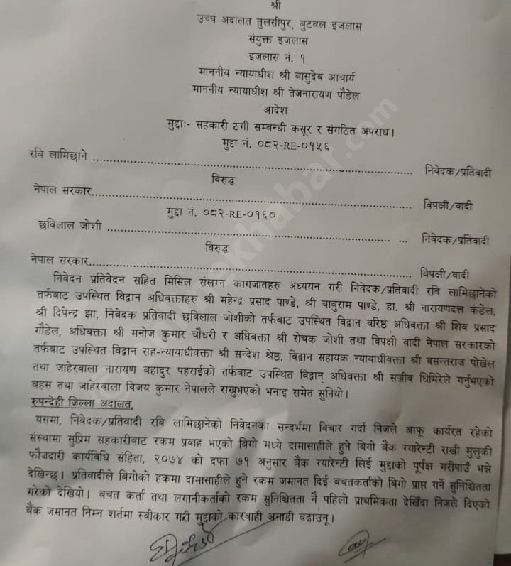 उच्च अदालत बुटवलका सूचना अधिकारी रामबहादुर कुँवरले रविलाई २ करोड ६८ लाख रुपैयाँ जमानतवापत राख्न र त्यो राखेमा थुनामुक्त गर्न आदेश दिएको हो । न्यायाधीश बासुदेव आचार्य र तेजनारायण पौडेलको इजलासमा उनीहरूको मुद्दाको सुनुवाइ भएको हो । लामिछानेले बिगो बापतको रकम बुझाएर थुनाबाहिर बस्नु पाउँ भनी निवेदन दिएका थिए । त्यो वापत उच्च अदालतले थप एक करोड रुपैयाँ धरौटी राख्नसमेत आदेश दिएको छ ।
