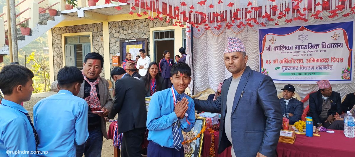 पोखरा, पोखरा महानगरपालिका वडा नम्बर ३३, आँपभुन्ज्याङस्थित कालिका माध्यमिक विद्यालयको ४३ औँ वार्षिकोत्सव तथा अभिवभावक दिवस सम्पन्न भएको छ । विद्यालय व्यवस्थापन समितिका अध्यक्ष मोहनबहादुर थापाको अध्यक्षतामा भएको कार्यक्रममा प्रमुख अतिथि गण्डकी प्रदेशका सांसद भीम कार्कीले सामुदायिक विद्यालयको विकासका लागि सबै लाग्नुपर्नेमा जोड दिए । कालिकाले शैक्षिक क्षेत्रमा गरेको उन्नतिको प्रशंसा गर्दै कार्कीले आफ्नो तर्फबाट विद्यालयका लागि आवश्यक सहयोग गर्न आफू सधैँ तयार रहने प्रतिबद्धता जनाए ।