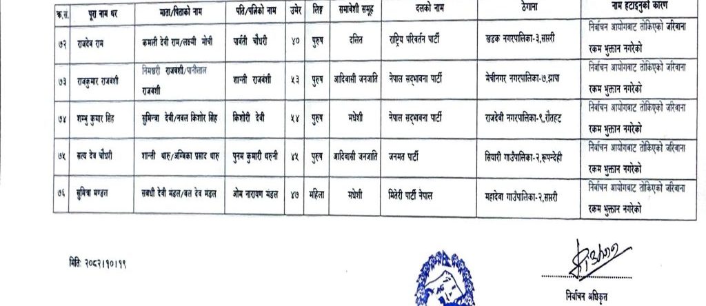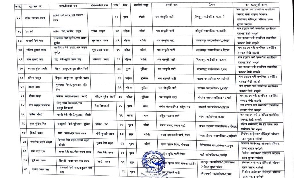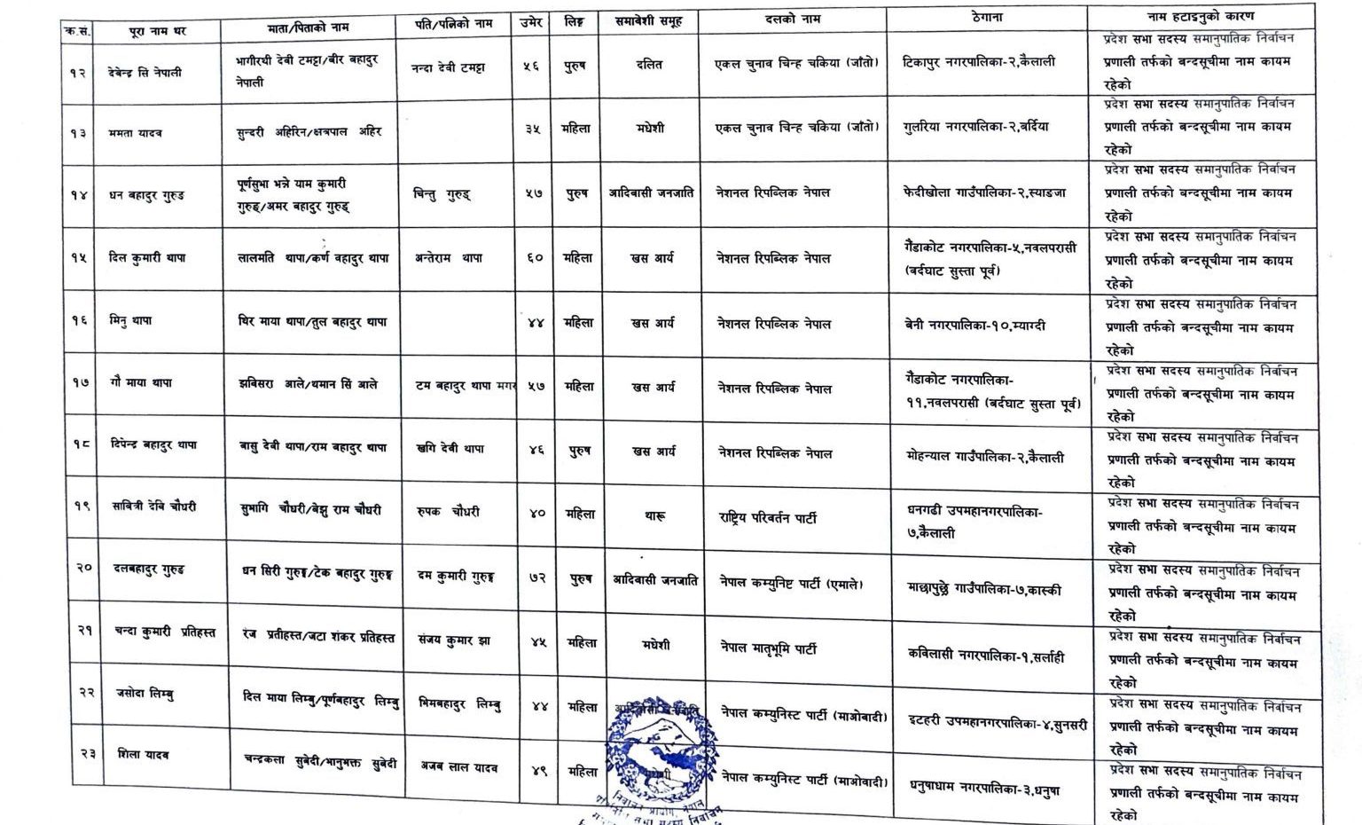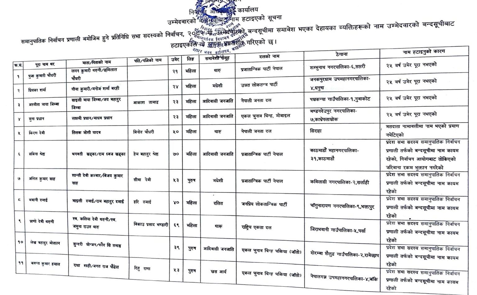 आयोगका अनुसार कर्जा सूचना केन्द्रको कालो सूचीमा रहेका २१ जना, प्रदेशसभाको बन्दसूचीतर्फ नाम कायम भएका २५ जना, आयोगको जरिवाना भुक्तान नगरेका १०, २५ वर्ष उमेर नपुगेका ४, मतदाता नामावलीमा समावेश नभएका १, मतदाता नामावली पिछडिएको क्षेत्रमा नरहेका २, महिलाको ठाउँमा पुरुष उम्मेदवारको रुपमा पेश भएका १, राजनीतिक दलबाट नाम हटाउन अनुरोध भएका १० र अन्य कारणबाट २ जनाको नाम हटाइएको हो ।