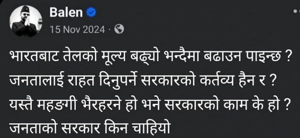 यस अगाडी बर्तमान प्रधानमन्त्री बालेन्द्र शाह काठमाडौँ महानगरपालिकाको प्रमुख रहेको बेला ‘भारतबाट तेलको मूल्य बढ्यो भन्दैमा नेपालमा बढाउन नहुने भन्दै जनतालाई राहत दिनु सरकारको कर्तब्य भित्र परेको उल्लेख गरेका थिए। उनले यस्तै महंगी भैरहने हो भने सरकारको काम के भन्दै प्रश्न गरेकोमा यस पटक यस्ता प्रश्नहरु प्रम बालेन्द्र तिर नै सोझिएका छन ।