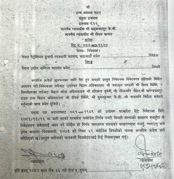 महासंघको सदस्यता सम्बन्धि बिषयलाई लिएर नेपाल पेट्रोलिय ढुवानी व्यवसायी महासङ्घसमेतको रिटमा उच्च अदालत पाटनका न्यायाधीशद्वय खड्कबहादुर केसी र दीपक खनालको संयुक्त इजलासले निवेदकको मागबमोजिम अन्तरिम आदेश जारी गरेको हो । अन्तरिम आदेश जारीसँगै अब सदस्यता विवादको टुङ्गो नलागेसम्म साधारण सभाको प्रक्रिया अघि बढाउन नमिल्ने भएको छ । यस अगाडी यहि चैत्र २३ गते बसेको अदालतको एक इजलासले साधारण सभा एबम अधिबेशन रोक्नको लागि अन्तरिम आदेश जारी हुने वा नहुने भन्ने छलफल गर्न भन्दै लागि बिहीबार दुवै पक्षलाई झिकाएको थियो ।