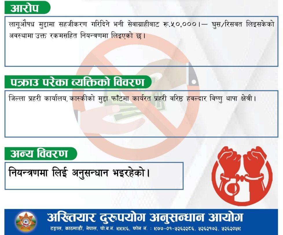 लागुऔषध मुद्दामा सहजीकरण गरिदिने भन्दै सेवाग्राहीसँग ५० हजार रुपैयाँ घुस लिएको अबस्थामा शनिबार उनलाई पक्राउ गरिएको हो। लागु औषध वा अन्य कुनैपनि अभियोगसहित प्रहरीले कसैलाई पक्राउ गरेमा आबश्यक अनुसन्धानपछि जिल्ला सरकारी वकिलको कार्यालयमा पठाउने फाइल तयार गर्ने काम मुद्दा शाखाले नै गर्छ।