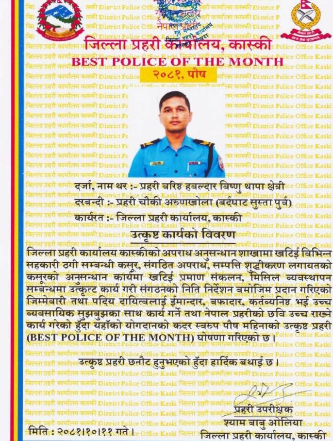 पोखरा, जिल्ला प्रहरी कार्यालय कास्कीले उत्कृष्ट प्रहरी घोषणा गरेर पुरष्कृत गरेको व्यक्ति (प्रहरी ) नै घुस सहित पक्राउ परेको छन । कास्की जिल्ला प्रहरी कार्यालयको मुद्धा फाँटमा कार्यरत वरिष्ठ हवल्दार विष्णु थापा क्षेत्री २०८१ माघमा ‘उत्कृष्ट प्रहरी’ (बेस्ट पुलिस अफ द मन्थ) बाट सम्मानित भएका थिए। जिल्ला प्रहरी कार्यालय कास्कीले उनलाई पुस महिनाको उत्कृष्ट प्रहरी घोषणा गरेको थियो उत्कृष्ट प्रहरीको सम्मान पाएको केहि महिना पछि नै उनि ५० हजार रुपैया घुसको रकम सहित पक्राउ परेका छन।